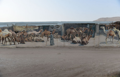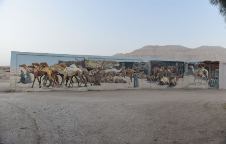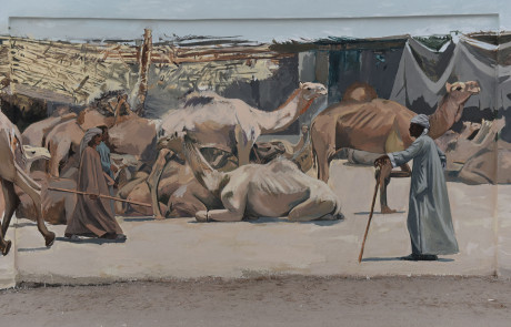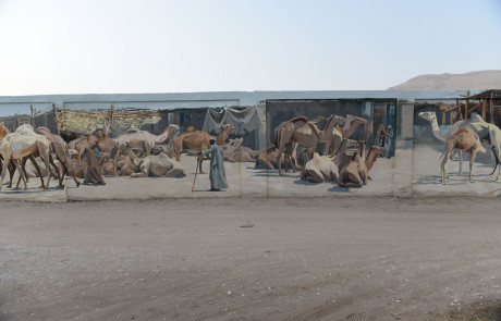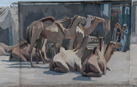Camel Market 2025 depicts a vibrant scene of a traditional camel market in Upper Egypt. The mural measures approximately 3.5 meters in height and 17 meters in width, and it was completed in five weeks. Its realistic portrayal of people, animals, and market life offers an authentic glimpse into the local daily routine.