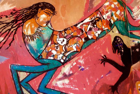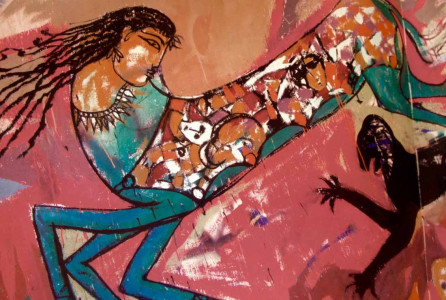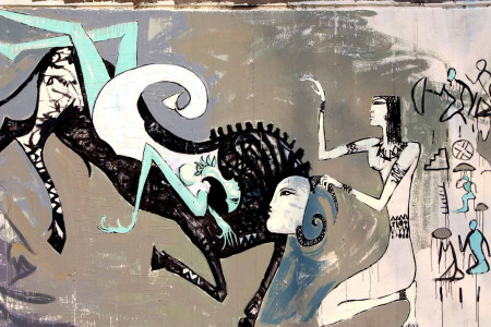 In this mural, he painted the Goddess Hathor, a goddess of love and motherhood, suckling a young and sickly boy next to scales that carried a feather on one scale and a heart being placed on the other. This is the weighing of the scale from the ancient Egyptian Book of the Dead, where the jackal-headed god Anubis weighs the heart of the deceased against a feather. If the heart weighed heavier, the deceased is condemned to non-existence.