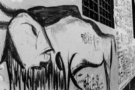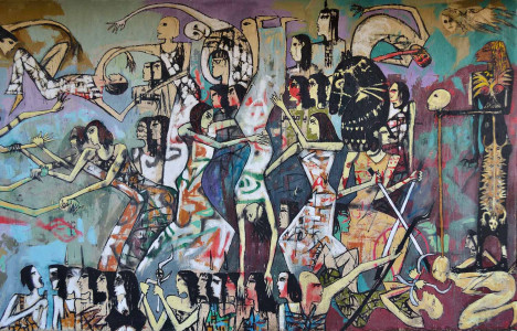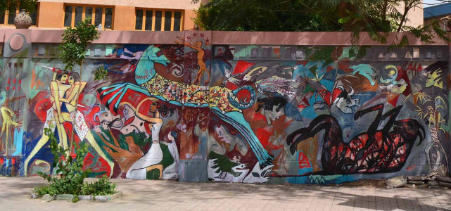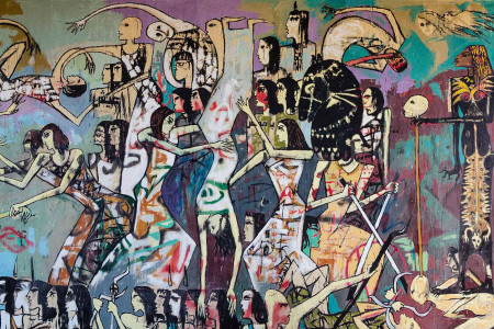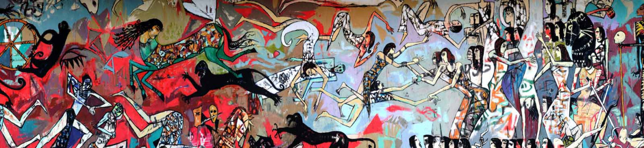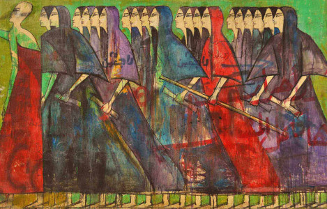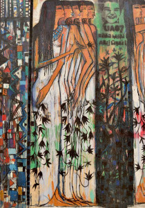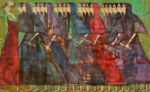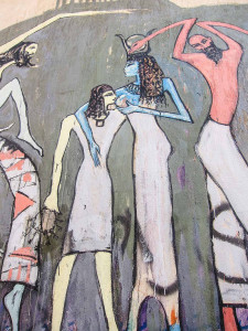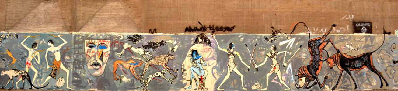 „Marching Women“ is a mural which consists of two main components, „women in the funeral march“ and „women climb the ladder“ . This work is based on an original image in the Ramesseum temple in West Bank of Luxor, a photo of engraved battle scenes on the Ramesseum’s First Pylon, Thebes. The Ramesseum has some of the Egyptian world’s oldest surviving pylons. A pylon, or monumental portal to an ancient Egyptian temple, usually consists of two massive upward tapering walls flanking and perpendicular to the temples entrance. Alaa Awad changed it, his painting made women instead of men apparent to the viewer. This work shows the strong role that women played in society in the past of Egypt and today. And we can see his meaning in the women’s hands—they have papyrus in their hands, this communicates the meaning of knowledge .