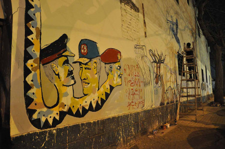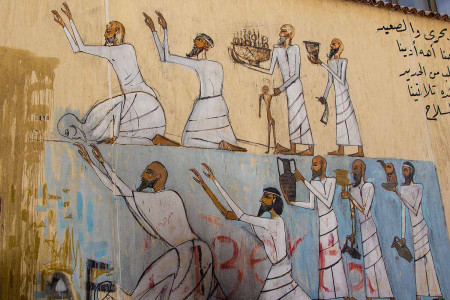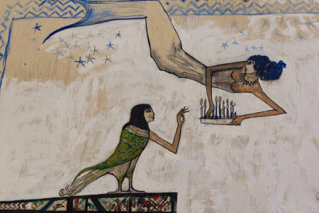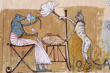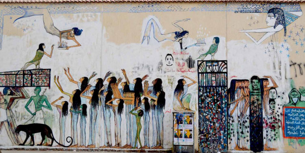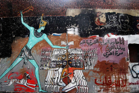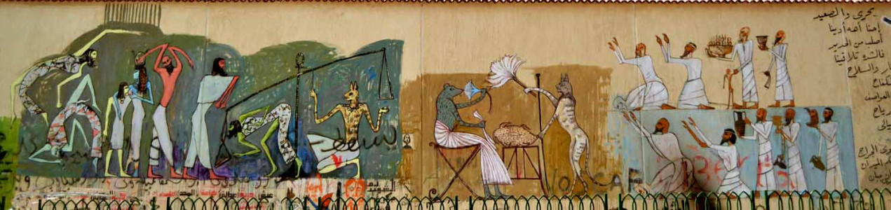 The mural from the tomb of Sobekhotep (18th dynasty) got Awad into particular trouble. In painting a row of bald and bearded men praying to and making offerings to a mouse on the throne, Awad seemed to be mocking religious zealots and members of the Muslim Brotherhood and Salafi parties. His timing was perfect; he painted the mural in late 2012, at a time when religious parties were gaining political power, a situation that generated distrust and frustration among secular protestors.
